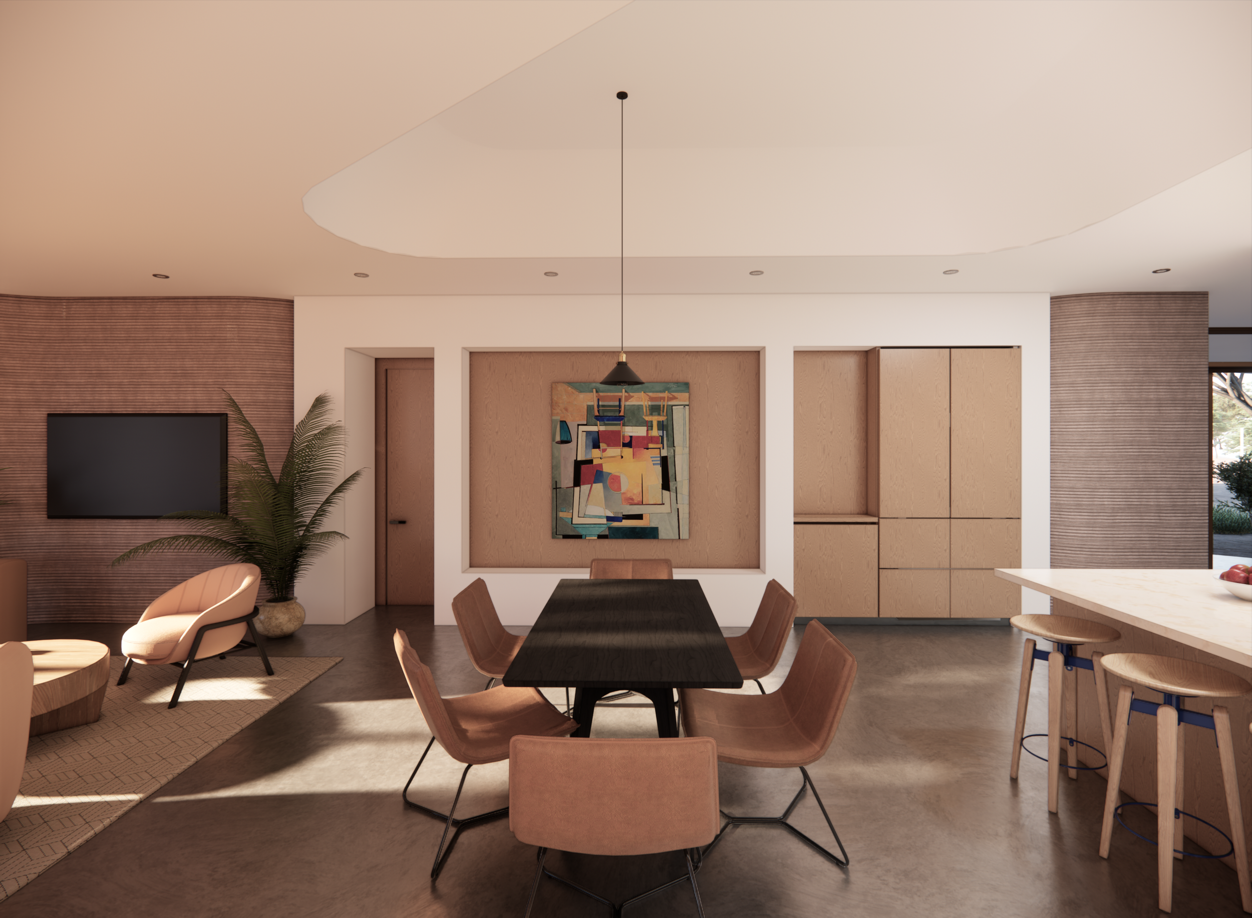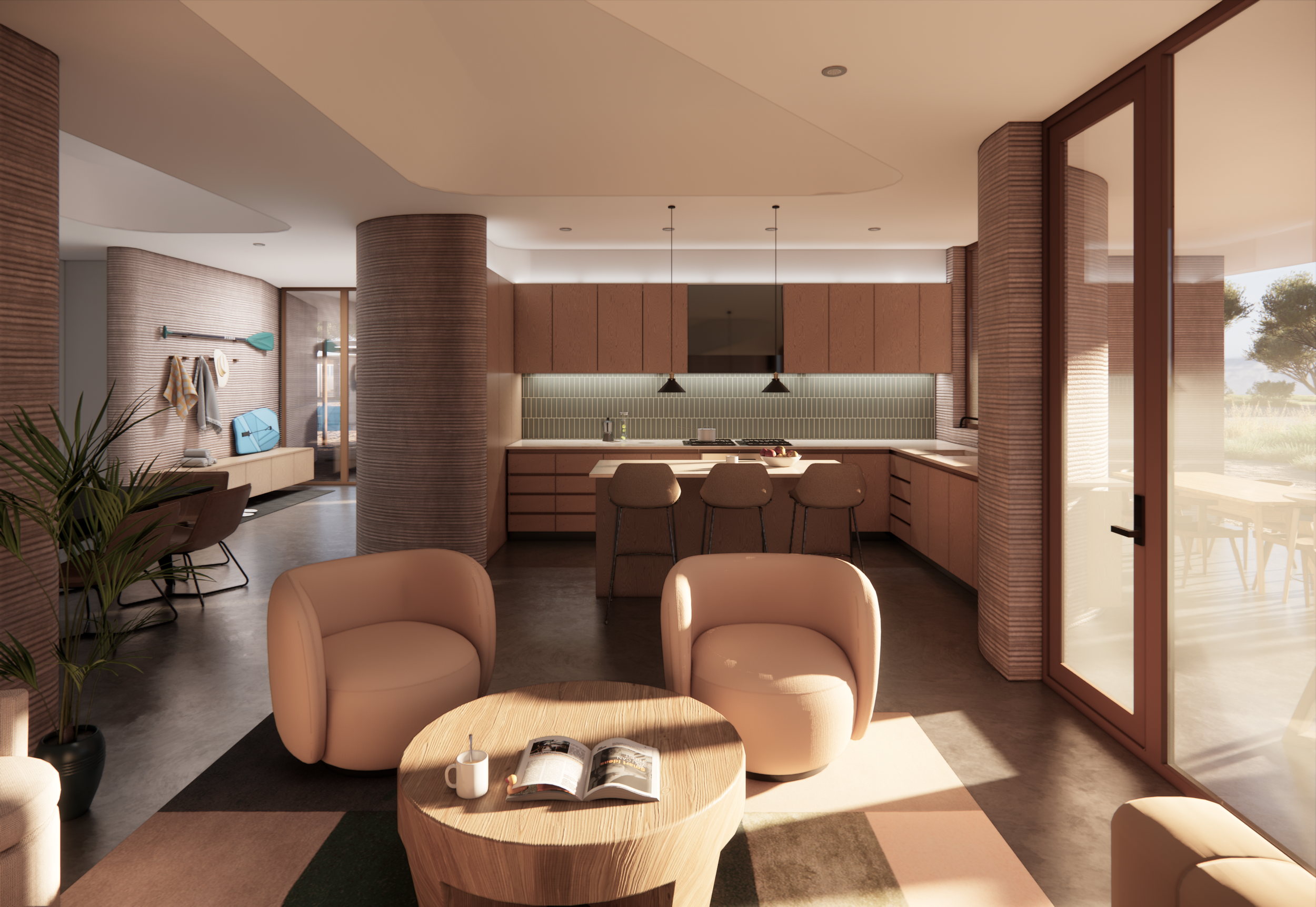Homeowners can choose between three floor plans to create their dream vacation home. Each plan was designed with a connection between indoors and out as a top priority. The wave-like geometry of the concrete emphasizes this and contributes to the seamless flow of the spaces. Whether hanging out in the living room, relaxing in bed, or waxing your board in the backyard, members can enjoy a view of the pool and connection to this awesome community.